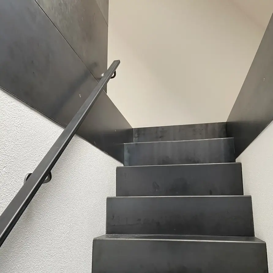 ATTENTION : Avec cette rampe escalier en métal, les extrémités sont soudées et finies de manière standard, pour une main courante robuste et bien finie. Veuillez noter que les extrémités ont une couleur différente à cause de la soudure. De plus, la teinte de la rampe en acier peut être différente de celle des supports, étant donné qu'il s'agit tout simplement d'un acier brut avec un revêtement thermolaqué transparent. C'est précisément cela qui crée l'aspect rustique et l'apparence robuste de cette main courante métallique !