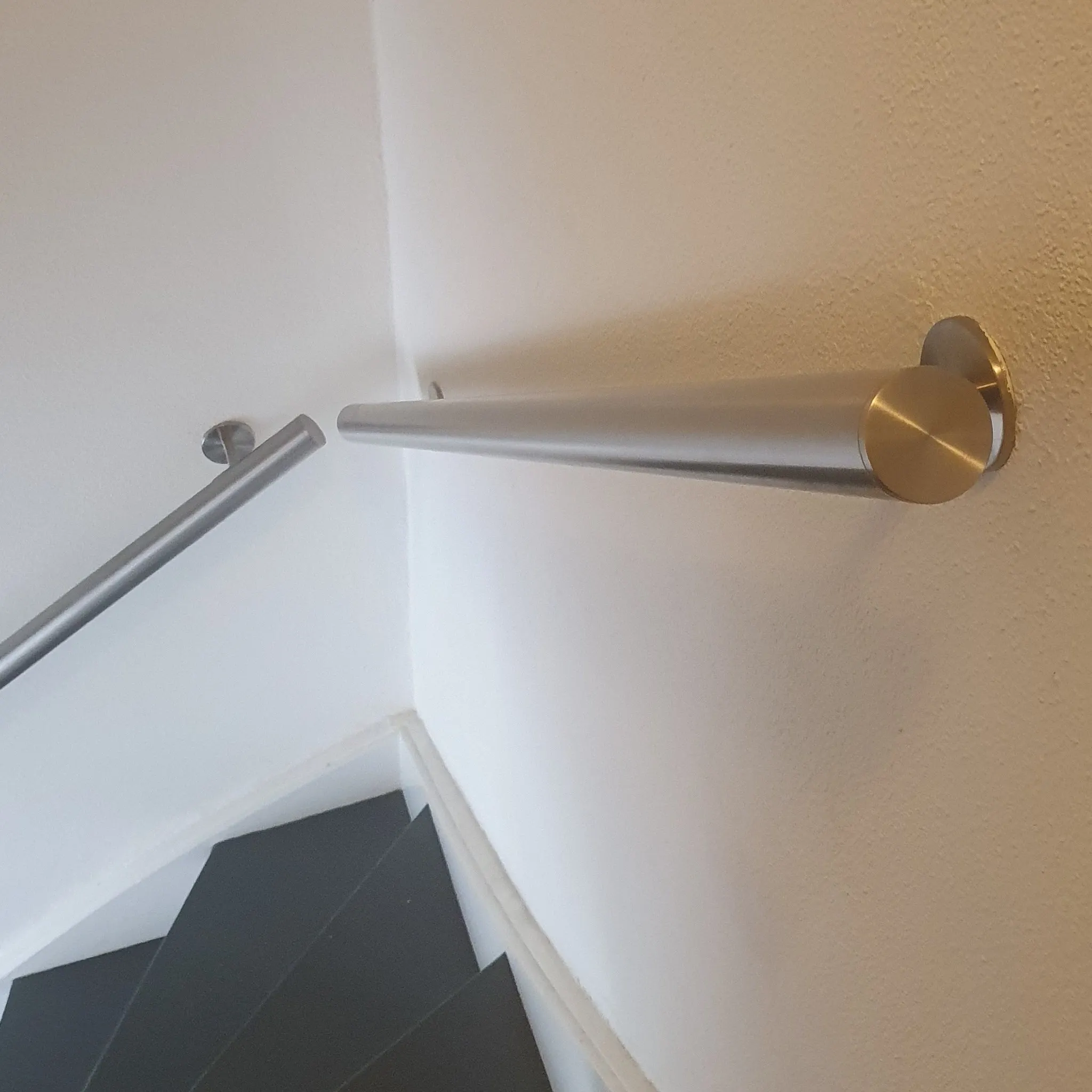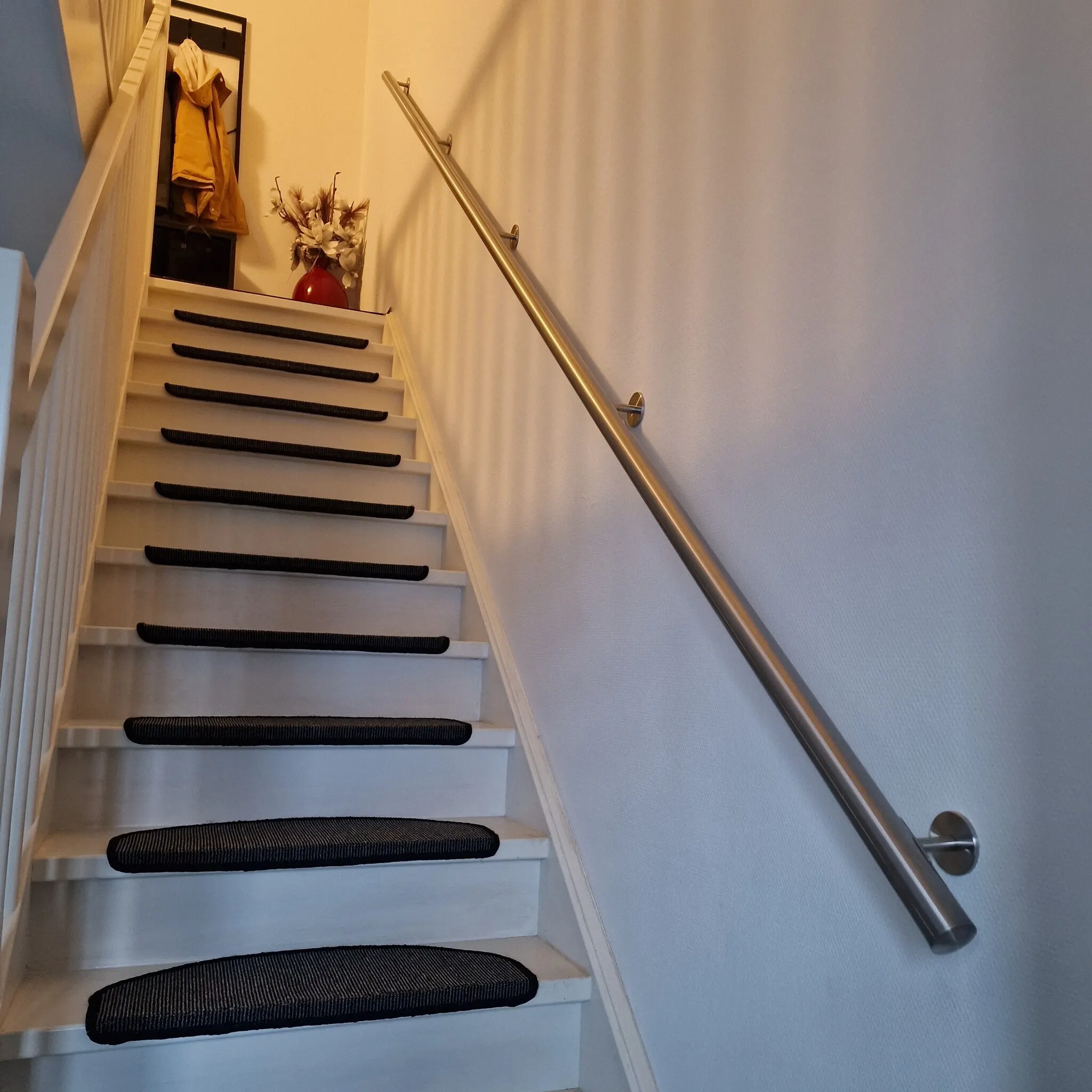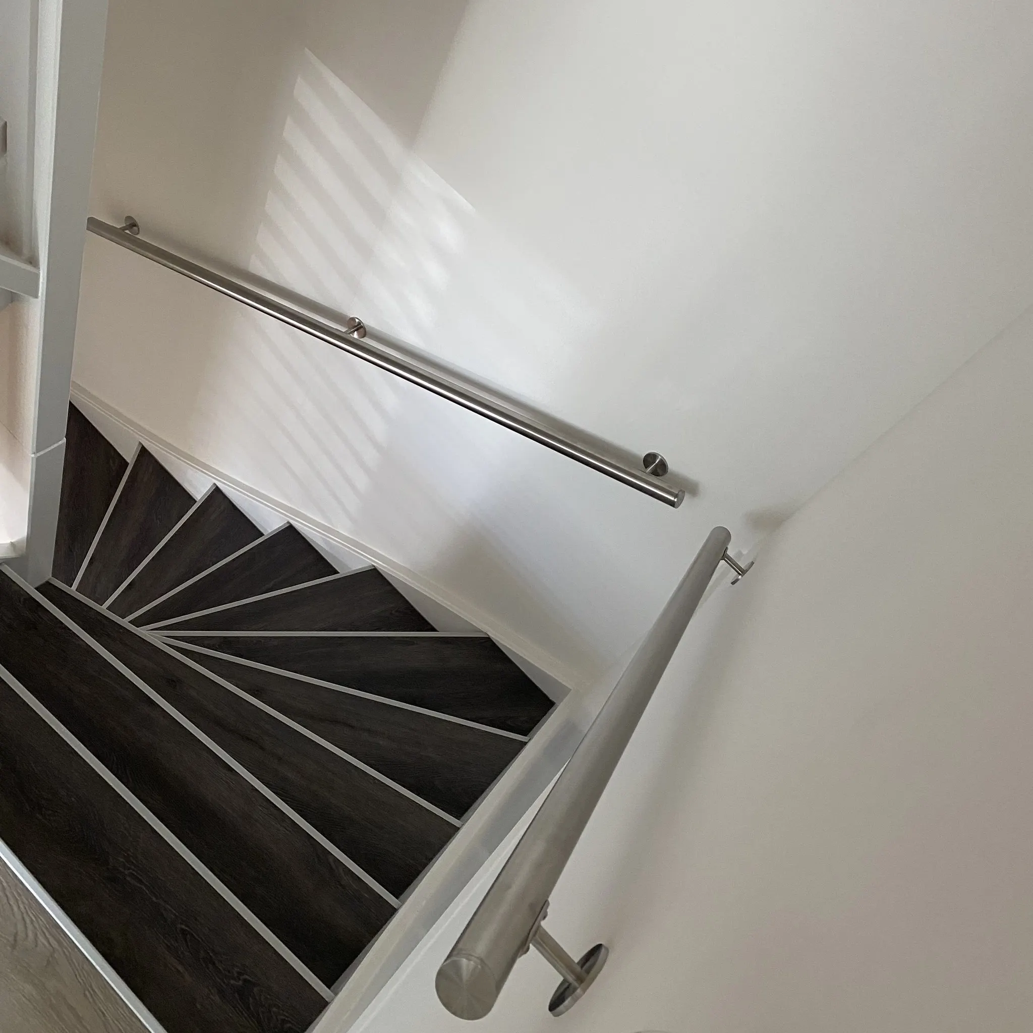 Kit main courante inox - ronde - avec supports de type 5 + matériel de fixation - sur mesure - de 30 à 400 cm - Rampe escalier acier inoxydable 304 brossé. Une main courante inox ronde en acier inoxydable 304 brossé (intérieur), d'un diamètre de 42,4 mm. Une rampe escalier ronde classique au look moderne, adaptée à un large éventail de styles d'intérieur.